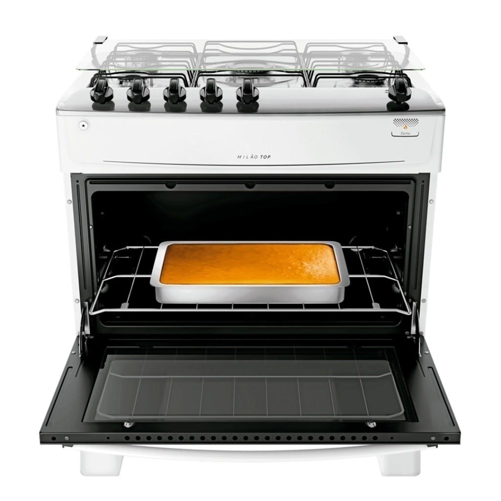 O Fogão 5 Bocas Atlas Milão Plus é bonito, prático e fácil de limpar. Do jeito que sua cozinha merece! Possui mesa em inox com tampa de vidro, que protege sua parede de respingos enquanto cozinha; acendimento automático; grades duplas; queimadores mais robustos e fáceis de limpar, sendo um deles Mega Chama; controle dos botões no topo da mesa; além de pés altos e botões removíveis, que facilitam na hora da limpeza. O forno possui capacidade de 86,5 litros, uma grade deslizante e é revestido com o acabamento Limpa Fácil.