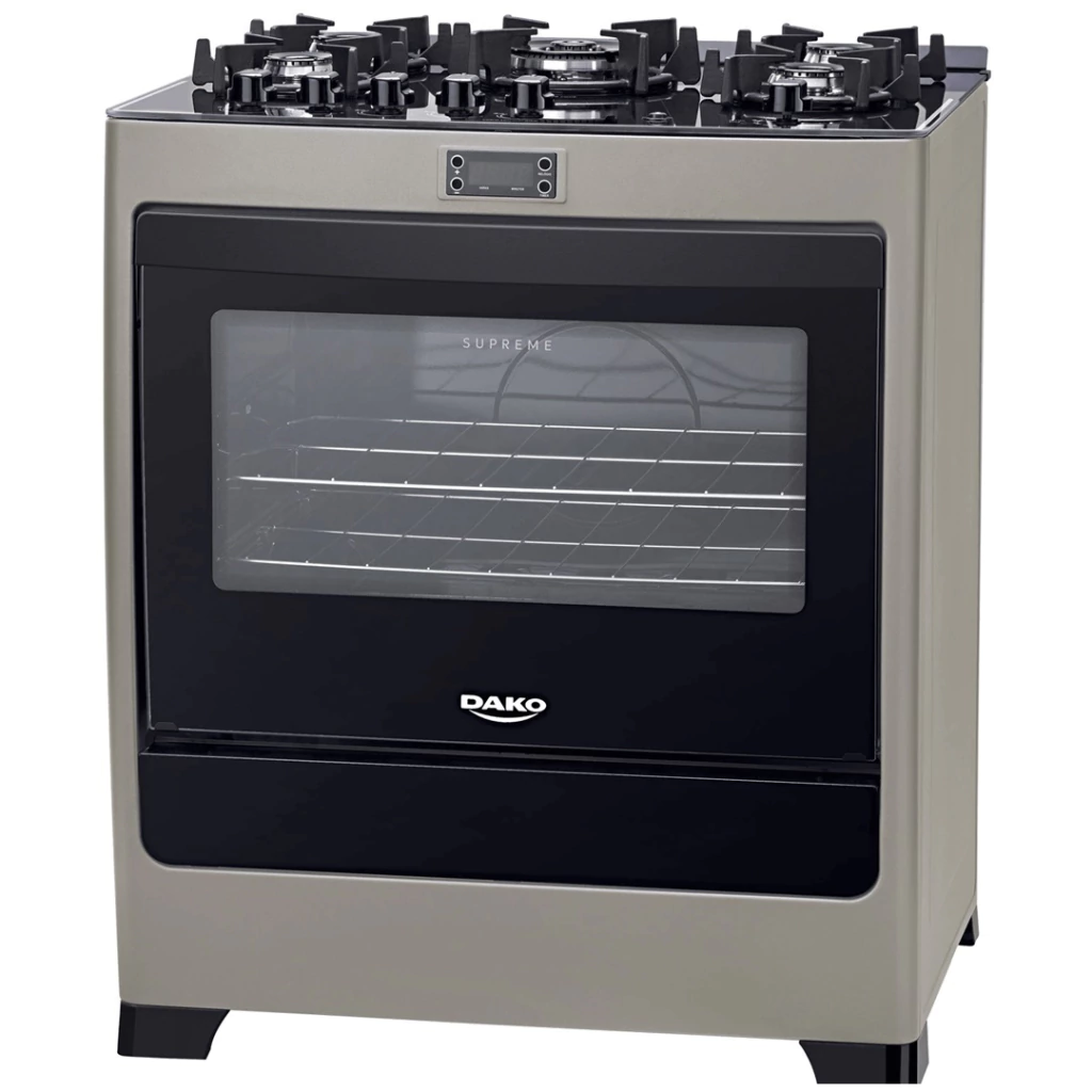 Fogão 5 Bocas Titanium com Mesa de Vidro e Timer Digital Dako Supreme Timer Glass: design e modernidade! Com mesa de vidro temperado sem moldura e top control, o fogão ainda conta com botões removíveis, que facilitam na hora da limpeza. Além disso, é equipado com trempes de ferro fundido, acendimento automático e timer digital com alarme sonoro, que permite o monitoramento de suas receitas. A versão 5 bocas possui 2 queimadores de 1,7kW, 2 queimadores Família de 2,0kW e 1 queimador Tripla Chama de 3,3kW. O forno possui excelente capacidade de 100 litros, com dimensões de 61,5 x 36 x 45 cm (largura x altura x profundidade), acabamento limpa fácil, iluminação interna (lâmpada acompanha o produto), 1 grade autodeslizante e 1 deslizante e porta com vidro duplo - que preserva o calor.